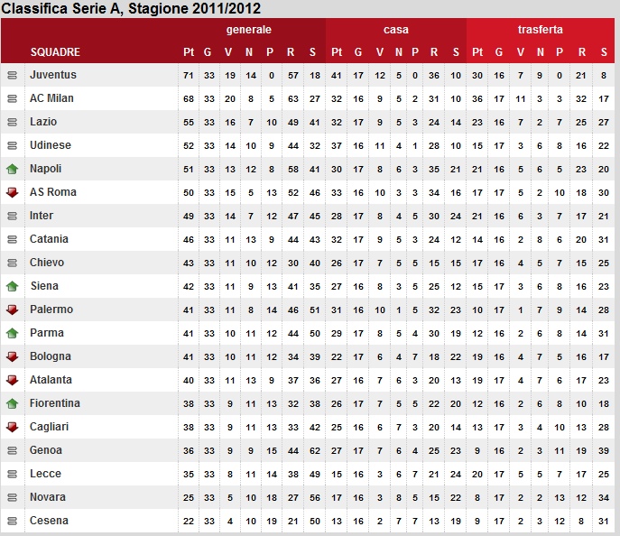 Classifica aggiornata dopo 33 giornate in attesa del recupero della 33a.