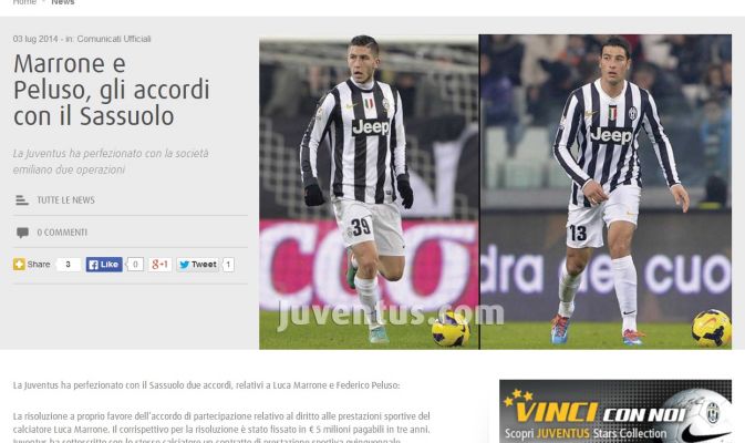 Juventus_05240_immagine_ts673_400La Juve e il Sassuolo hanno ufficializzato l’acquisto a titolo definitivo di Federico Peluso. Il difensore, classe 1984, arriva dalla Juventus. Il club neroverde ha anche comunicato che la“compartecipazione del centrocampista Luca Marrone è stata risolta a favore della Juventus”. Marrone, classe ’90, nell’ultima stagione ha giocato con il Sassuolo. “L’Unione Sportiva Sassuolo Calcio comunica di aver completato le seguenti operazioni di mercato: PELUSO Federico (’84, difensore): acquisito a titolo definitivo dalla Juventus F.C.